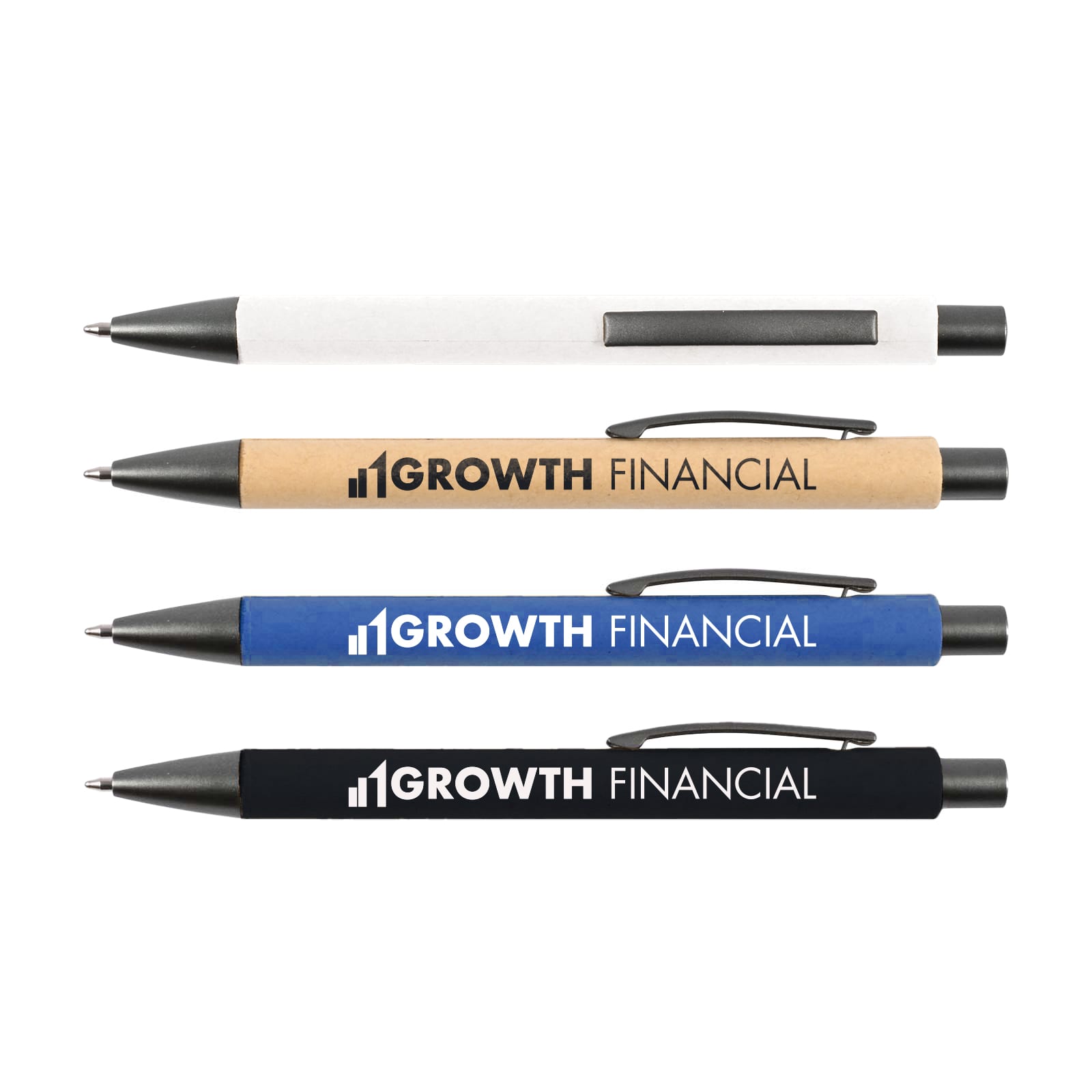 Introducing the Aspen Paper Pen—a stylish and sustainable writing instrument crafted with an eco-conscious mindset. This ballpoint pen features a recycled paper barrel accented with gunmetal highlights, a plastic button, tip, and a metal clip. With an impressive writing distance of 2.1 kilometres, the Aspen Paper Pen ensures long-lasting performance for all your writing needs. Available in four colours—white, blue, black, and natural. Pen sleeves and pen boxes available at additional cost.