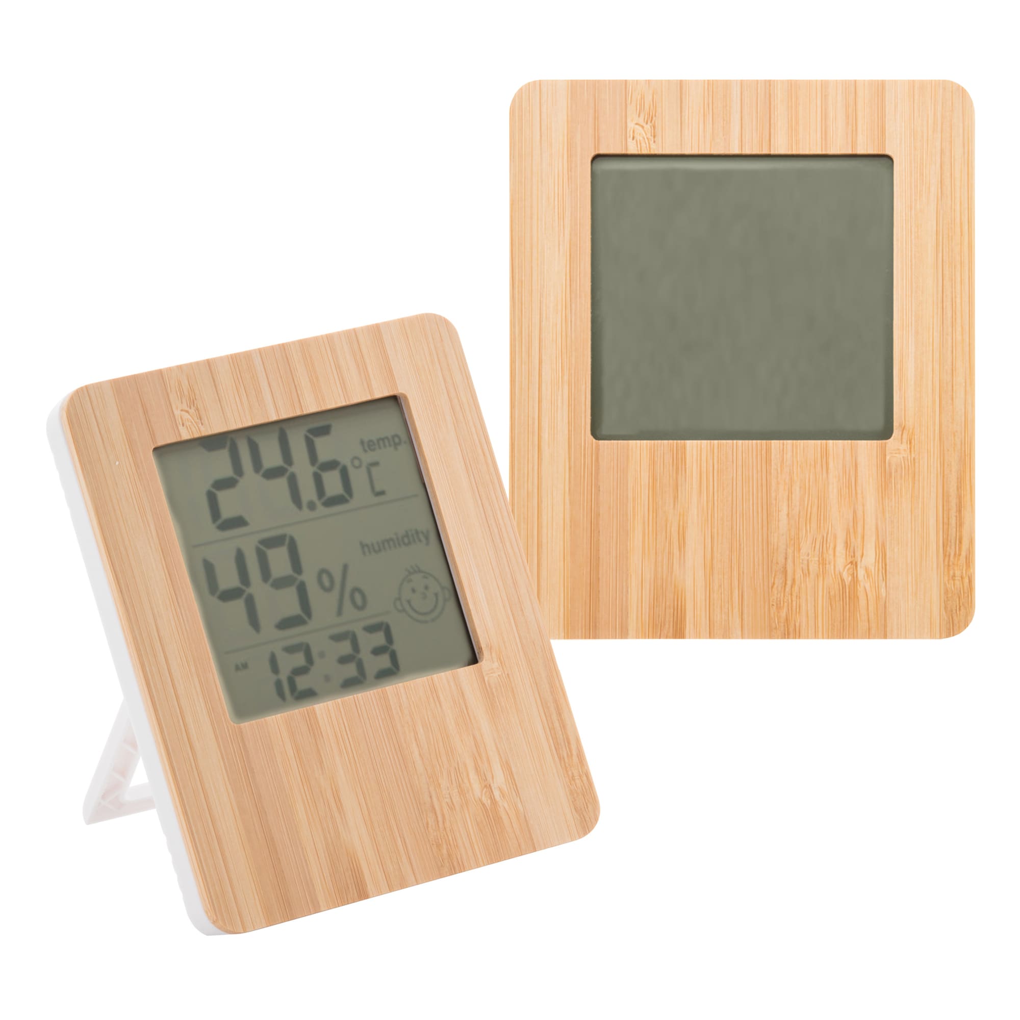 Multifunctional smile digital bamboo alarm clock with LCD display. It displays both 12 and 24 hour format times alarm clock temperature and humidity functions. It is presented in a natural kraft box with instructions. Requires 2x AAA batteries which are not included.