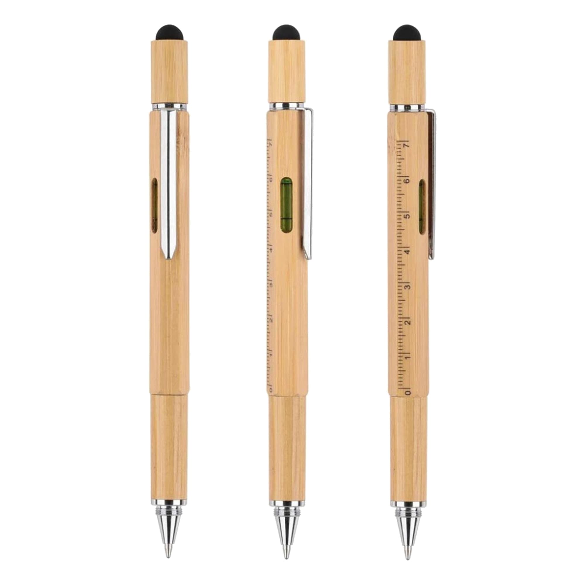 This twist action handy Bamboo Tool pen has a range of functions including a spirit leveller 7cm and 2inch rulers Philips head and flat head screw driver bits and an integrated stylus. Features silver metal clip and a specially made high quality German manufactured black ink refill with about 1200 meters writing distance and tungsten carbide ball. The perfect tool to always have in your pocket while being eco conscious.