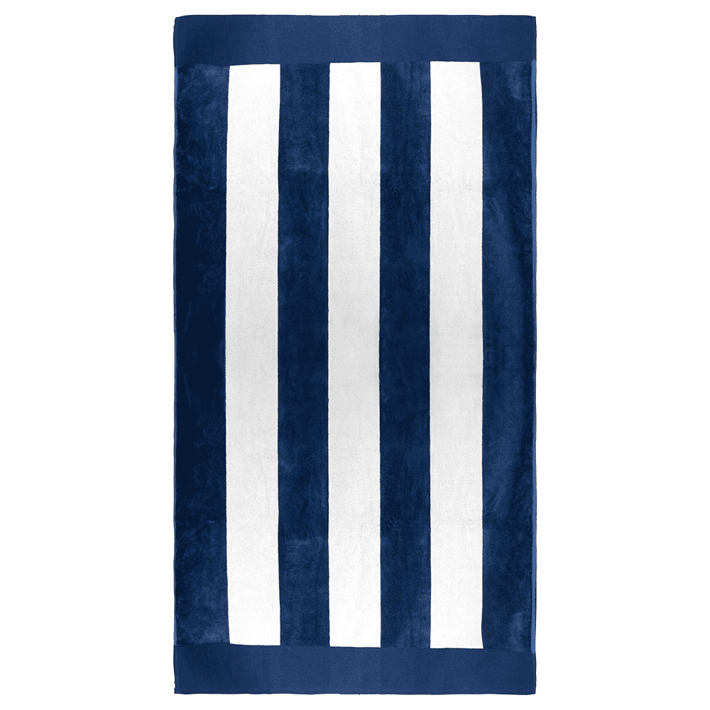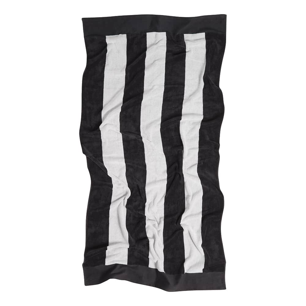 Features Deluxe striped jacquard beach towel made from 100% cotton and 500gsm velour one side and terry towelling on the other. Available in black with white stripes and blue with white stripes.
