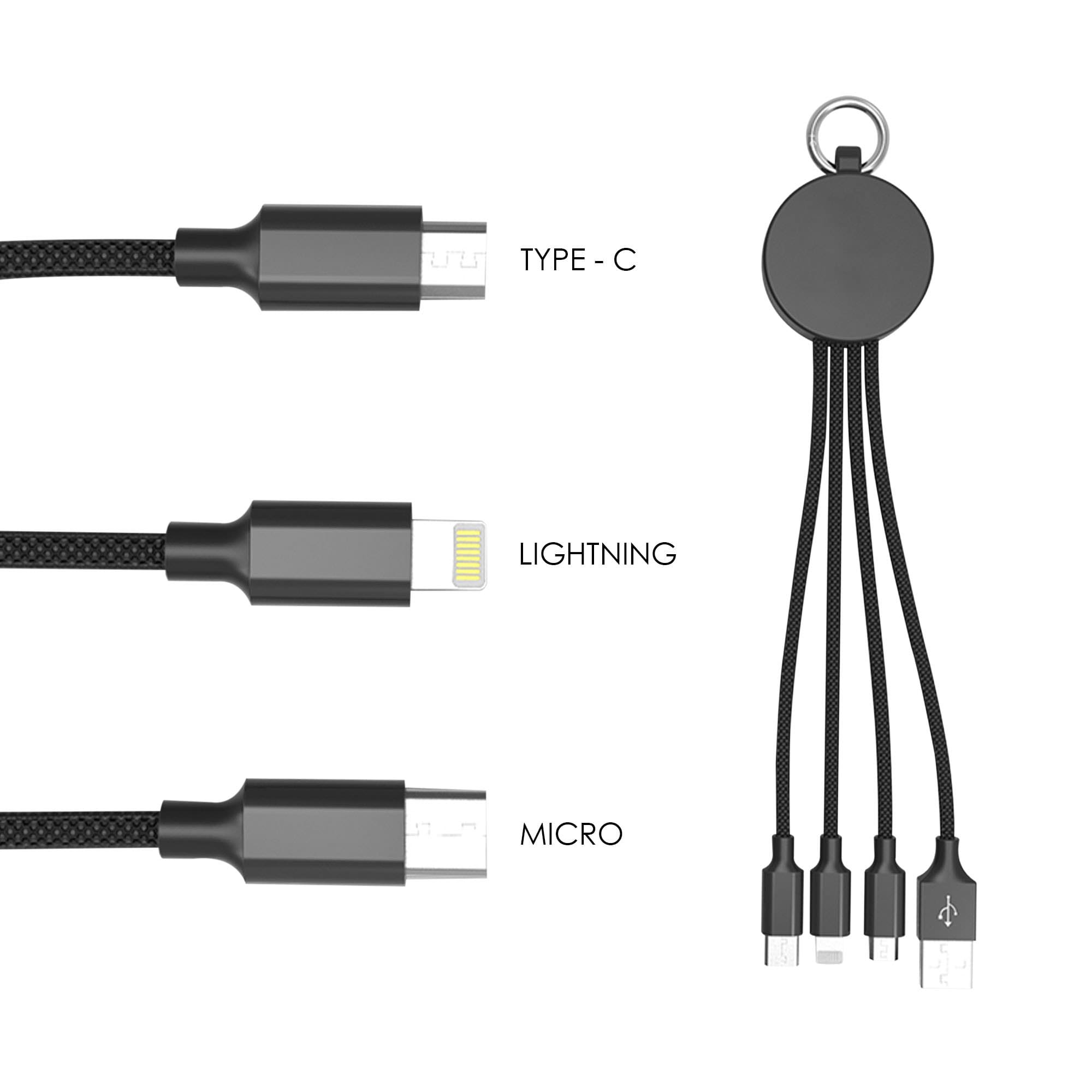 3-in-1 illuminating cables are the perfect promotional giveaway to get daily exposure at a low price. They offer different connectors of Lightning 8 pin Type C Micro USB which allow you to charge different devices at the same time. Braided cables top part is made of ABS and has a LED light inside to turn your engraved logo into indicator to tell you when your device is charging or syncing and a bottle opener on other side of top part. Each piece even includes a keyring to hang on your bag or keys. Ideal for tech events trade shows conferences and more.