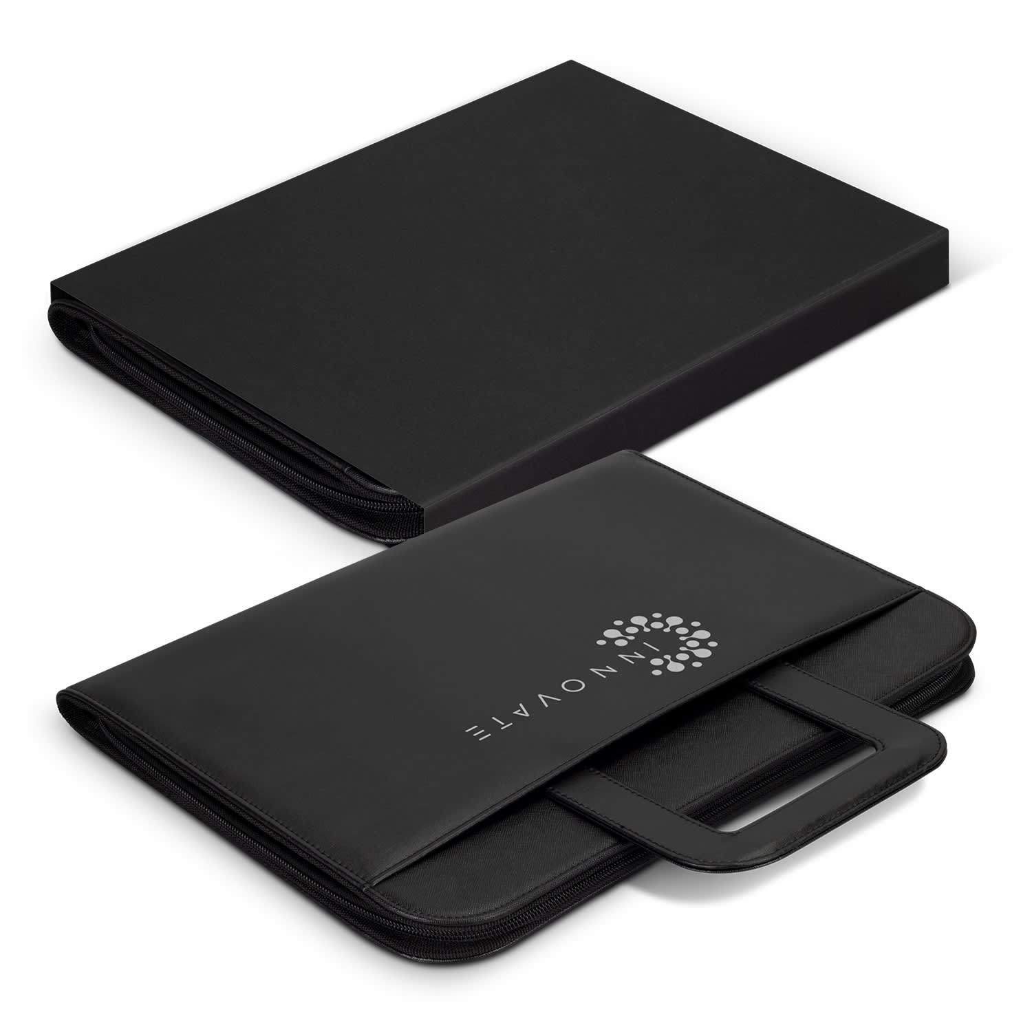 * PU portfolio with foldaway away handles and zippered closure