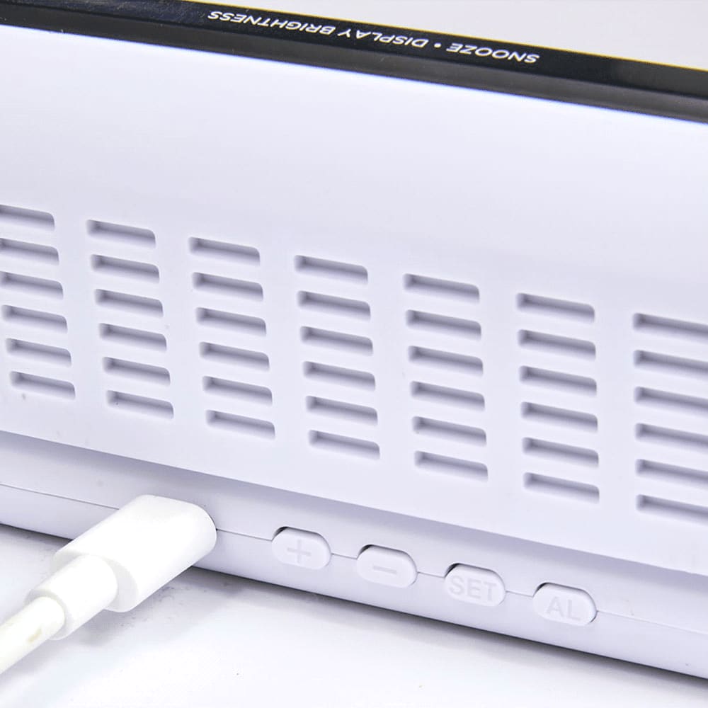 The Digital Power Clock is a sleek, adjustable digital alarm clock that incorporates a powerful 15W wireless charger, and has a compact, foldable design for easy travel and storage. Offering up to 15W of wireless power for Android devices and up to 7.5W for All iPhone 8/X/11/12/13/14/15 Series. Compatible with most plastic phone cases, this charger includes a 39-inch Type-C to Type-C cable. For optimal performance, it is recommended to use a UL or ETL Listed 20W USB-C power adapter.