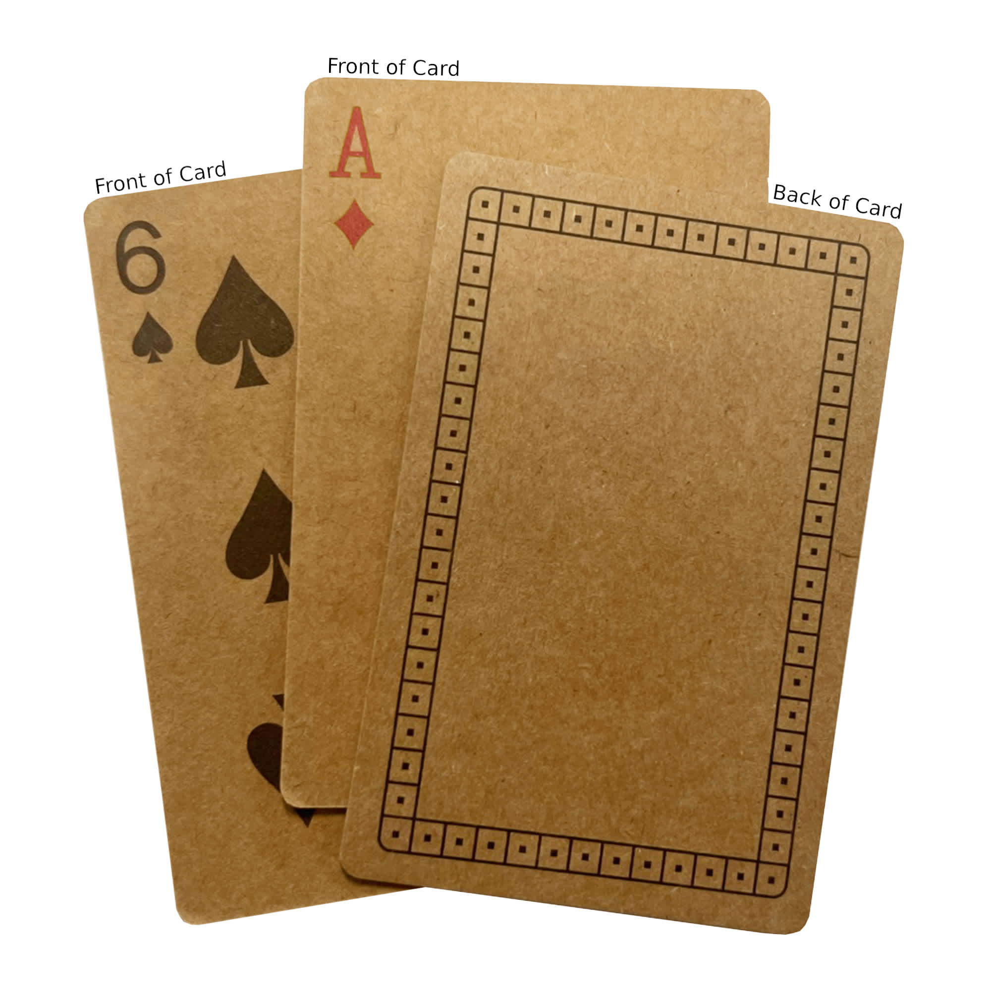 Set of 54 playing cards with no spare cards in a brown cardboard box with branding options on the back of brown cards and also on the brown cardboard box.