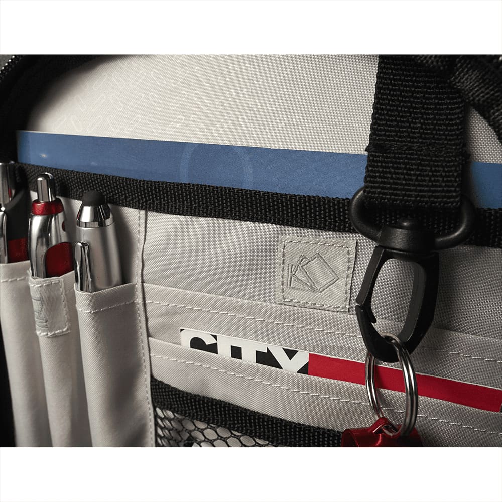 Features Side entry laptop compartment holds up to 17 inch laptops. Main zippered compartment with file divider, interior side pockets and removable Tech Trap elastic organiser panel. Zippered media pocket accesses earbud port. Front zippered pocket with deluxe organiser and key fob. Front lower & hidden pockets for valuables. Three side roomy zippered pockets. Yoke-style handle. Padded back and shoulder straps for comfort. Back panel designed to slip over trolley handles. Main compartment capacity is approximately 30 litres.