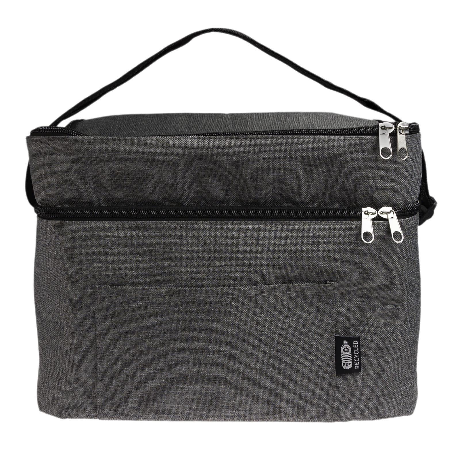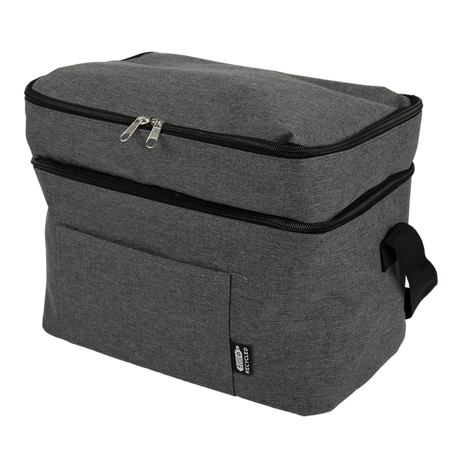 Discover the Duo RPET 2 Compartment Cooler Bag, a practical and eco-conscious solution for keeping your food and beverages cool. Made from RPET polyester 600D with PEVA lining and PE foam, this cooler bag is available in Navy Blue or Grey, offering a stylish and sustainable choice to suit your preference. It features two separate compartments to keep items organized and fresh. The adjustable black polyester web carry strap ensures comfortable transport, while the front pocket (180mm x 110mm) is perfect for storing small items like keys or bottle openers. Measuring approximately 300mm x 210mm x 220mm H and with a 14L capacity, this large cooler bag is ideal for various occasions. It includes an internal care label and an RPET tag on the outside, highlighting its sustainable design. The black zipper closure adds a sleek touch to its functionality.
