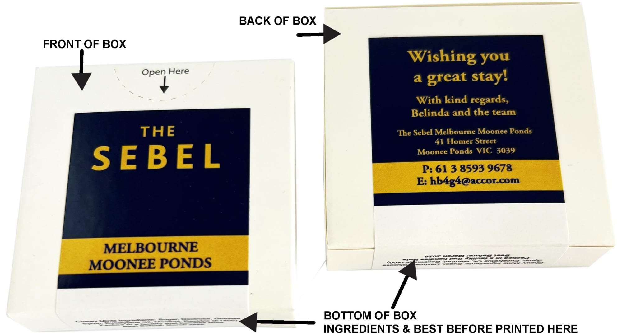 | Graphic Type & Size | Full Colour Sticker LARGE BRANDING AREA allows for branding on the front & back of box Sticker size 40mmW x 112mmH |