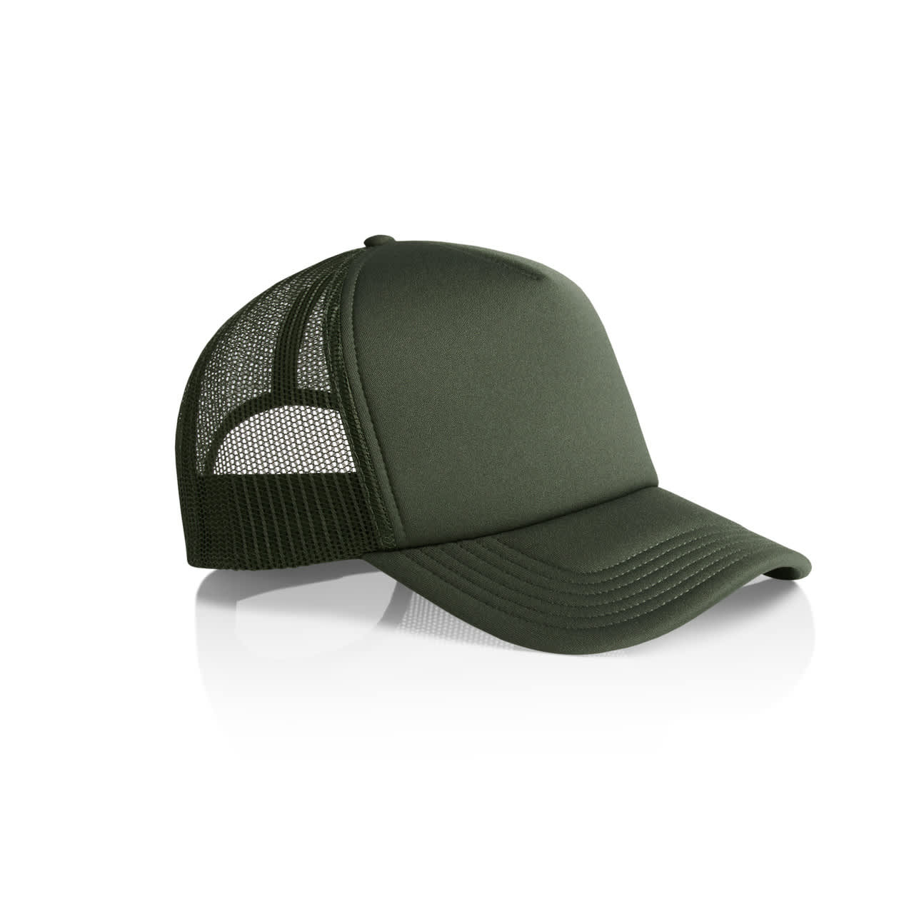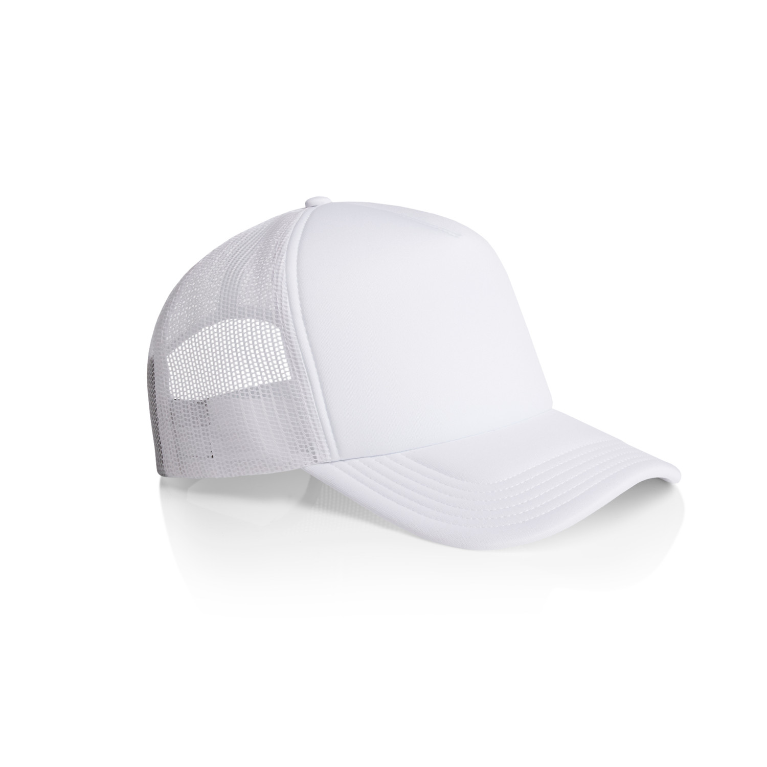 Showcasing the AS Colour Frame Foam Trucker: A high-profile snapback cap with a curved peak, featuring a mid-weight construction with a 100% polyester foam front and peak, and a breathable 100% recycled polyester mesh back. Includes a plastic snapback closure, tonal under-peak lining, and tear-out AS Colour label for added comfort and customisation.