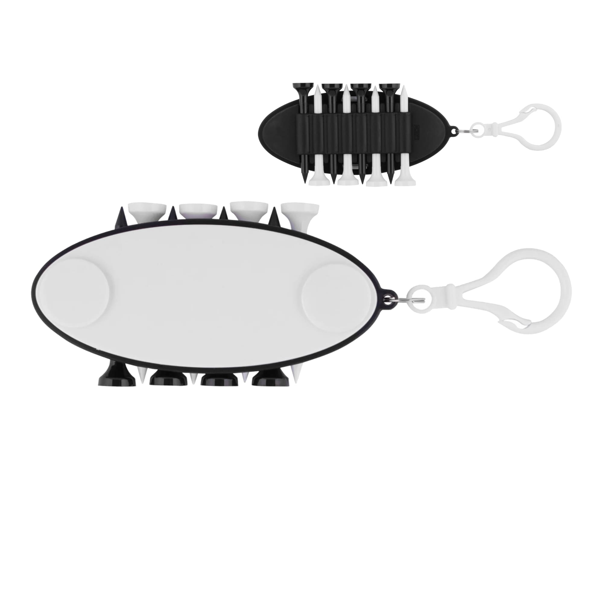 Durable ABS plastic case holding eight golf tees made from PS plastic two round white ball markers and a plastic clip to attach the set to a belt loop golf bag or even a set of keys. The perfect pack for every golfer.