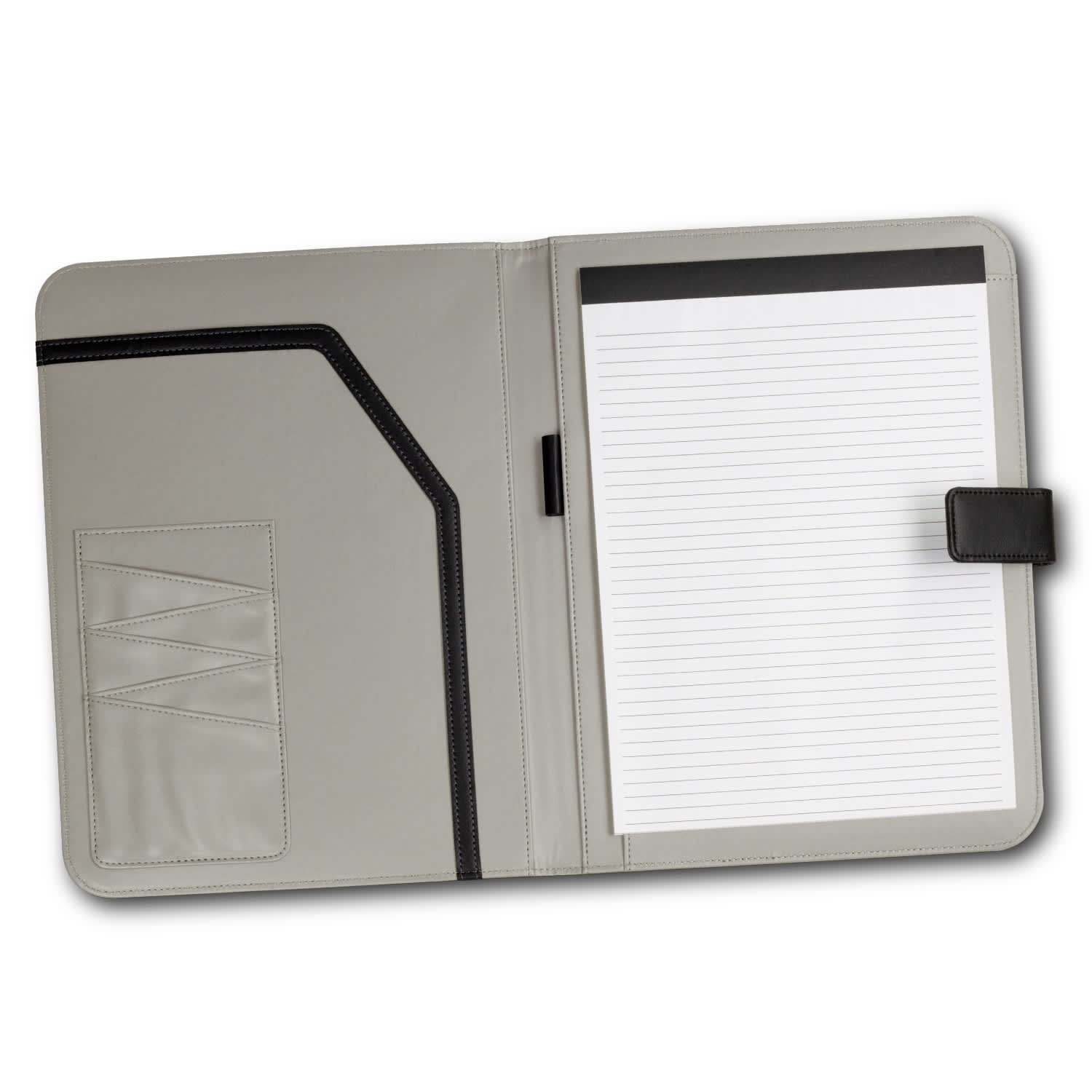 Professional PU leather portfolio with a magnetic strap closure. It comes with an A4 lined pad, one main pocket, five business card holders, and one pen loop. It is presented in an individual black cardboard sleeve.