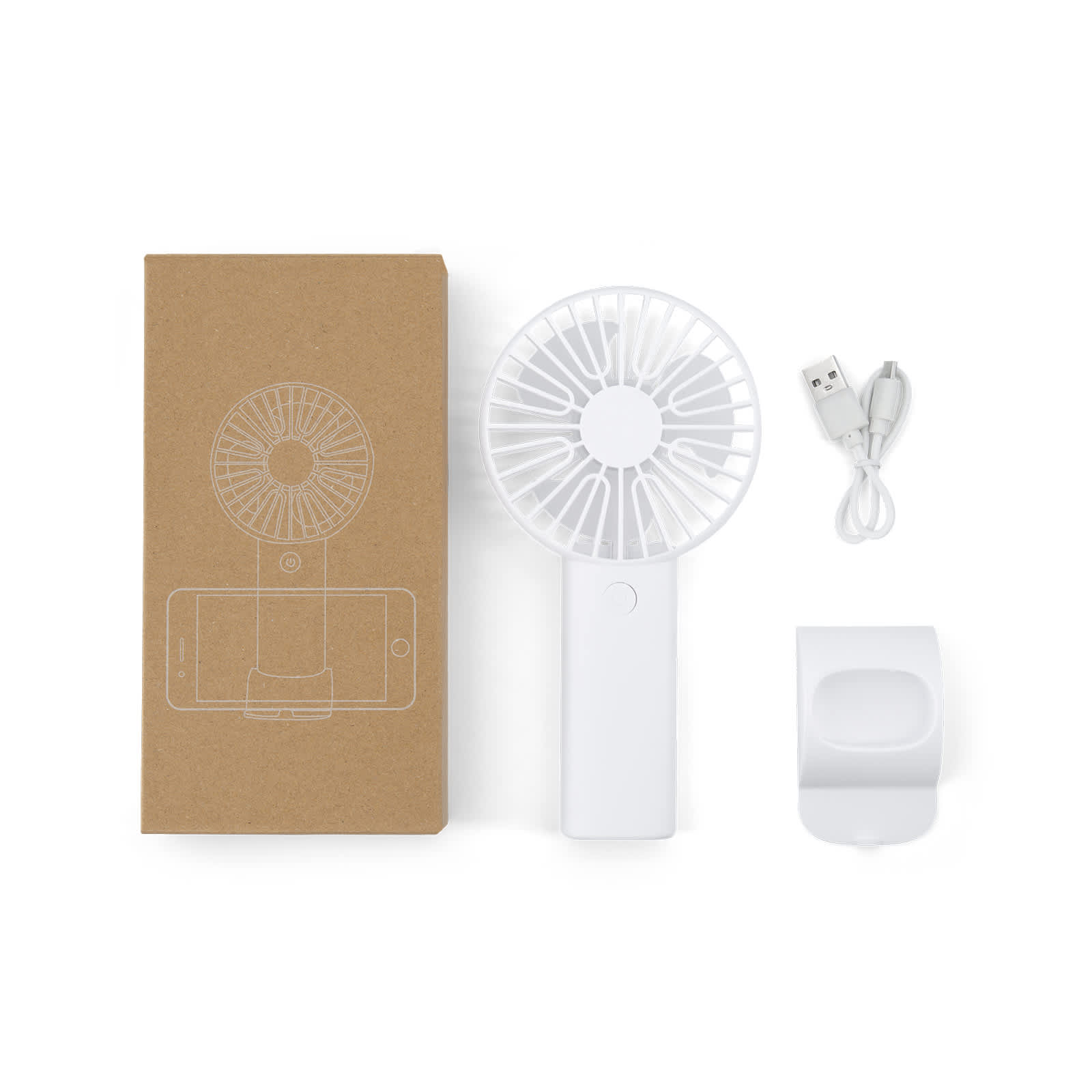 The Heatwave Fan is a compact, rechargeable cooling solution designed for convenience and everyday use. With three speed settings, it delivers refreshing airflow on demand, whether you’re holding it in hand or placing it upright on your desk with the integrated stand. A clever phone stand attachment at the base of the handle adds further functionality, making it perfect for both personal use and branded promotions. Powered by a 300mAh lithium-ion battery, it recharges easily with the supplied 150mm USB-A to Micro USB cable. Each unit is neatly packaged in a kraft tuck box with a white product image for a professional, retail-style presentation.