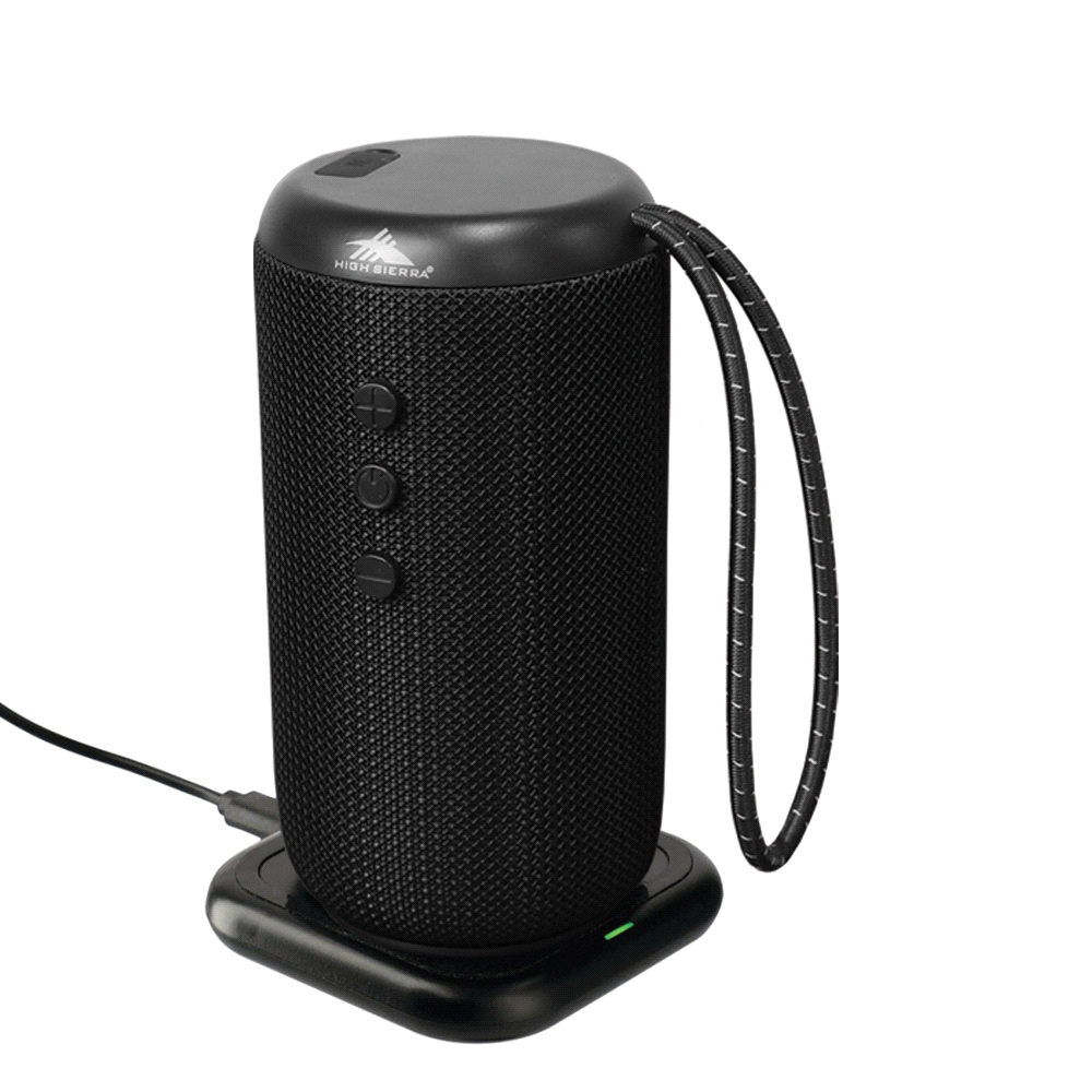 | Features | Charge the wireless speaker with a wireless charging pad or micro USB cable (included). The High Sierra Kodiak IPX7 outdoor bluetooth speaker includes built-in music controls and microphone, 2x3-Watt stereo sound, passive radiator and 10-meter Bluetooth working range. |