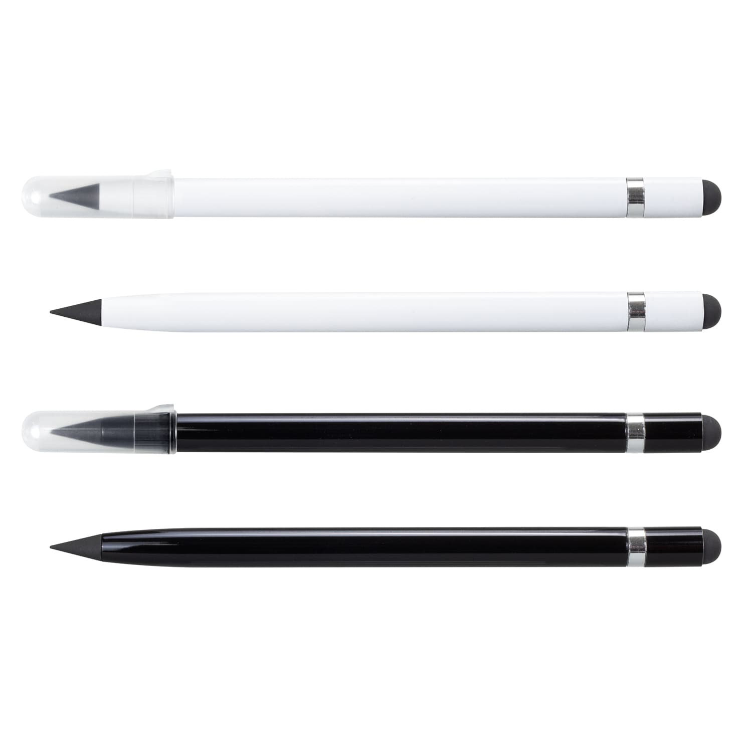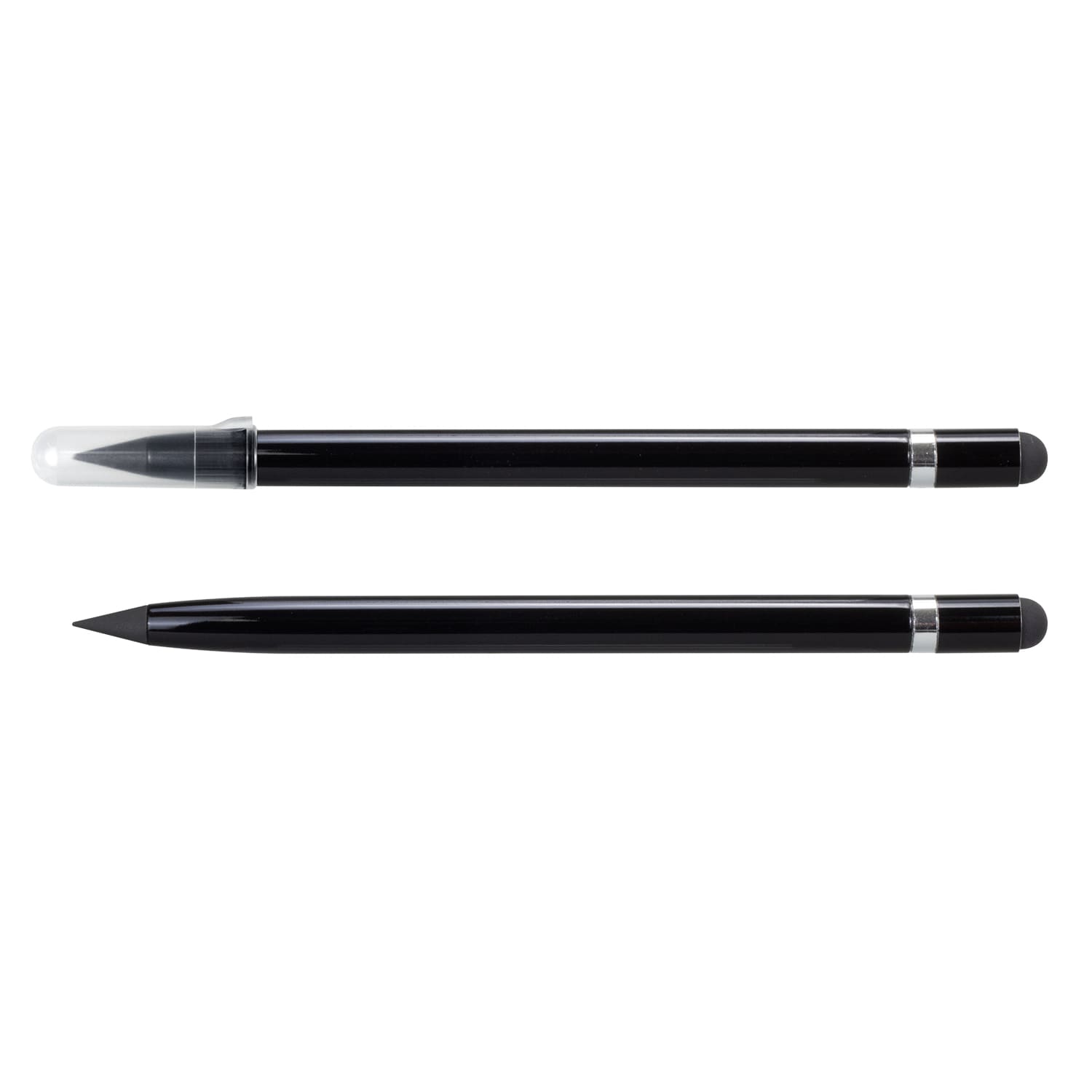 The aluminium Infinity Inkless Pen has a unique metal alloy tip that deposits small amounts of metal onto the page and has a writing distance of up to 5000m. This pen features shiny chrome trim, a stylus and an eraser. With no sharpening or refills needed, this is an excellent environmentally conscious option. Infinity Inkless Stylus Pen can be presented in an optional pen sleeve.