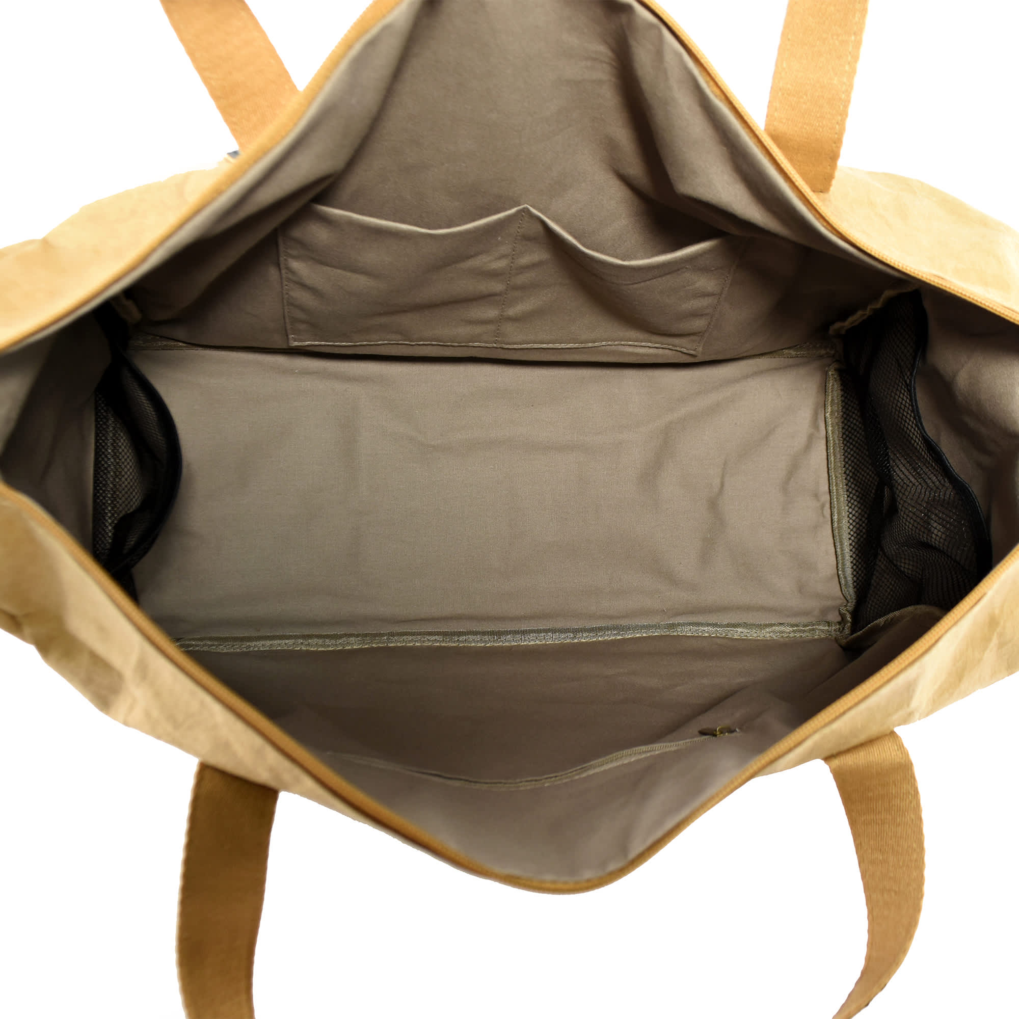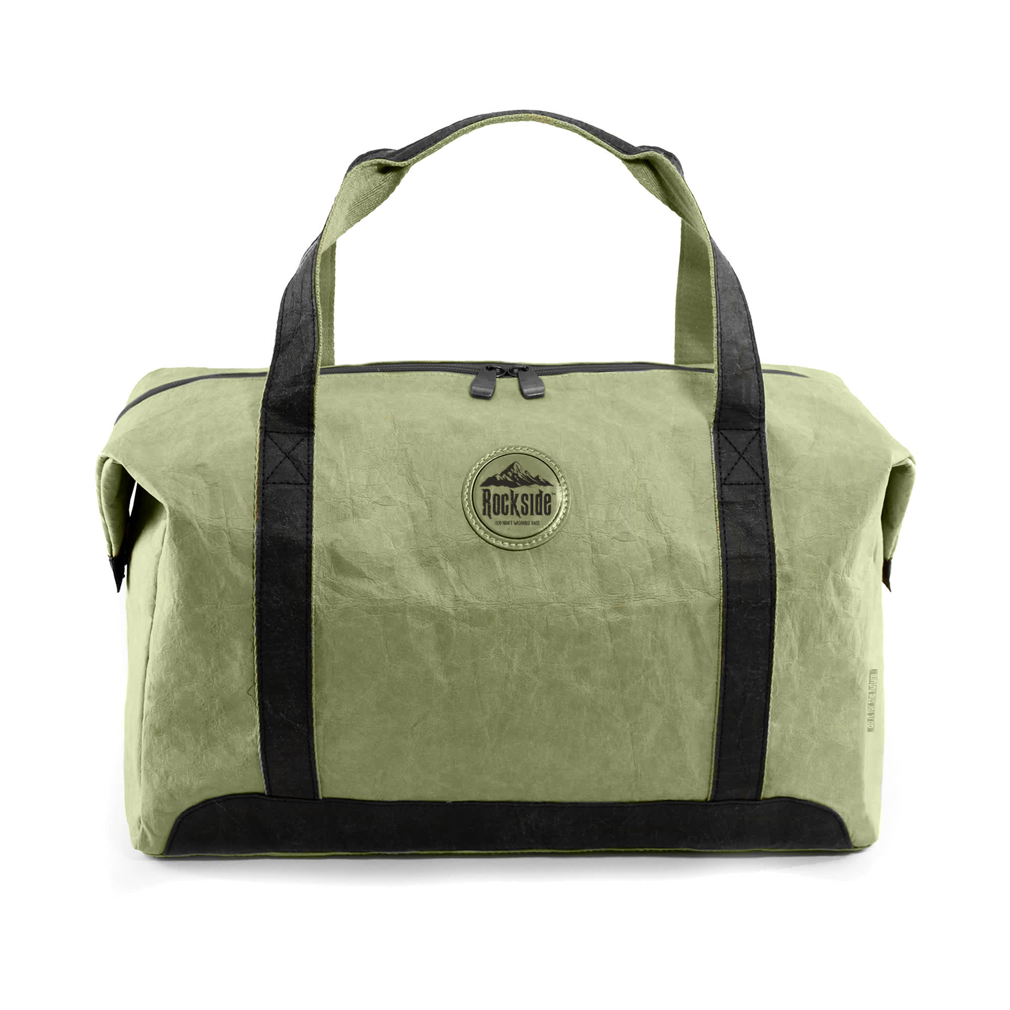 Joy Kraft Paper Travel Bag is made of German 0.55mm kraft paper with canvas lining combines durability and functionality making it a practical and stylish choice for various activities such as travel gym sessions or weekend getaways. The use of washable kraft paper gives it a unique and modern look while the combination of brown polyester webbing and black kraft paper for the handles adds both comfort and style. Two open pockets two mesh pockets and one zipper pocket inside bag offer ample storage options and easy access to essentials making it a versatile and reliable bag for your on-the-go needs. Note that this item comes stock with the “Rockside” brand on front leather patch.