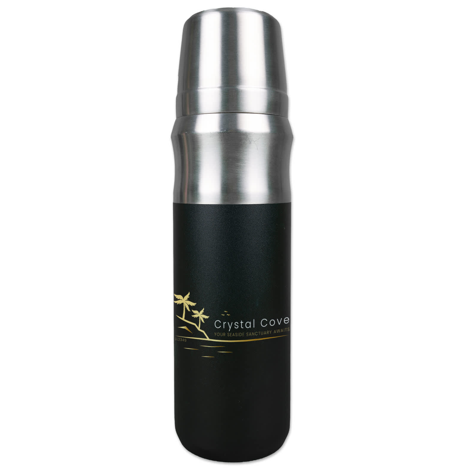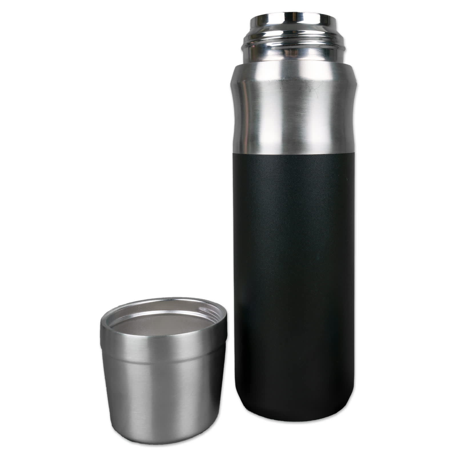 The Monte 600ml Vacuum Flask, designed for superior insulation while on the go. This flask features a double wall construction with 304 grade stainless steel inner and outer layers, ensuring your beverages stay hot or cold for longer. The sleek black powder coating covers approximately 150mm from the base, complemented by a grey lid. The screw-open/push-button lid and stainless steel screw-on cup add convenience to your drinking experience. The cup is perfect for tea, coffee, hot or cold beverages, and more. Standing at approximately 260mm tall (including the cup) with a diameter of 73mm, this flask is perfect for on-the-go hydration.