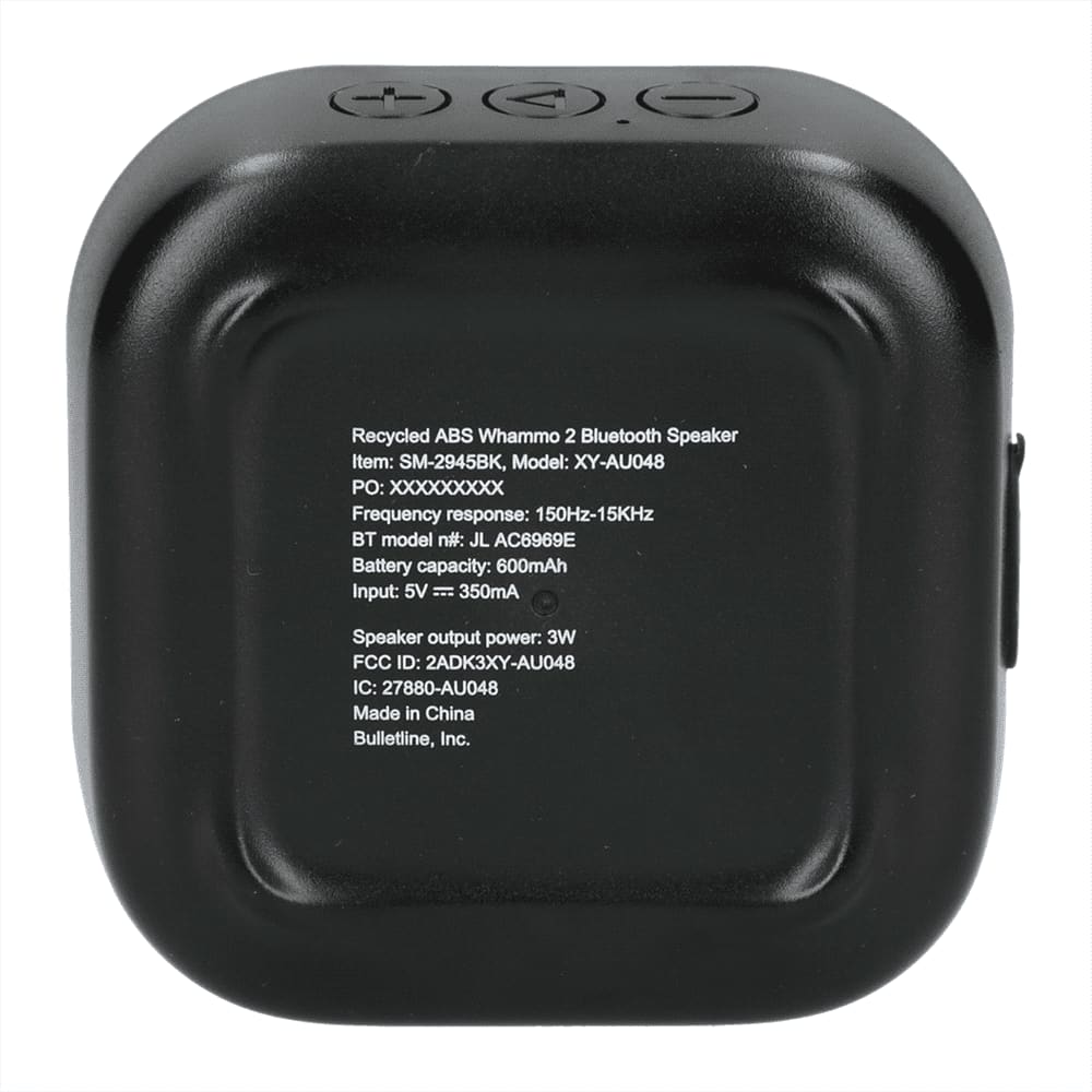 Your favorite speaker is now partially made from recycled ABS plastic. The Whammo 2.0 Bluetooth® Speaker packs quality sound into a compact size. The battery lasts up to four hours at max volume and can be fully charged in three hours. The built-in microphone and music controls let you make or receive calls while controlling the audio. The Bluetooth® working range is 10 meters (33 feet). The speaker output is 3 Watts. The gift box is made from sustainable material.