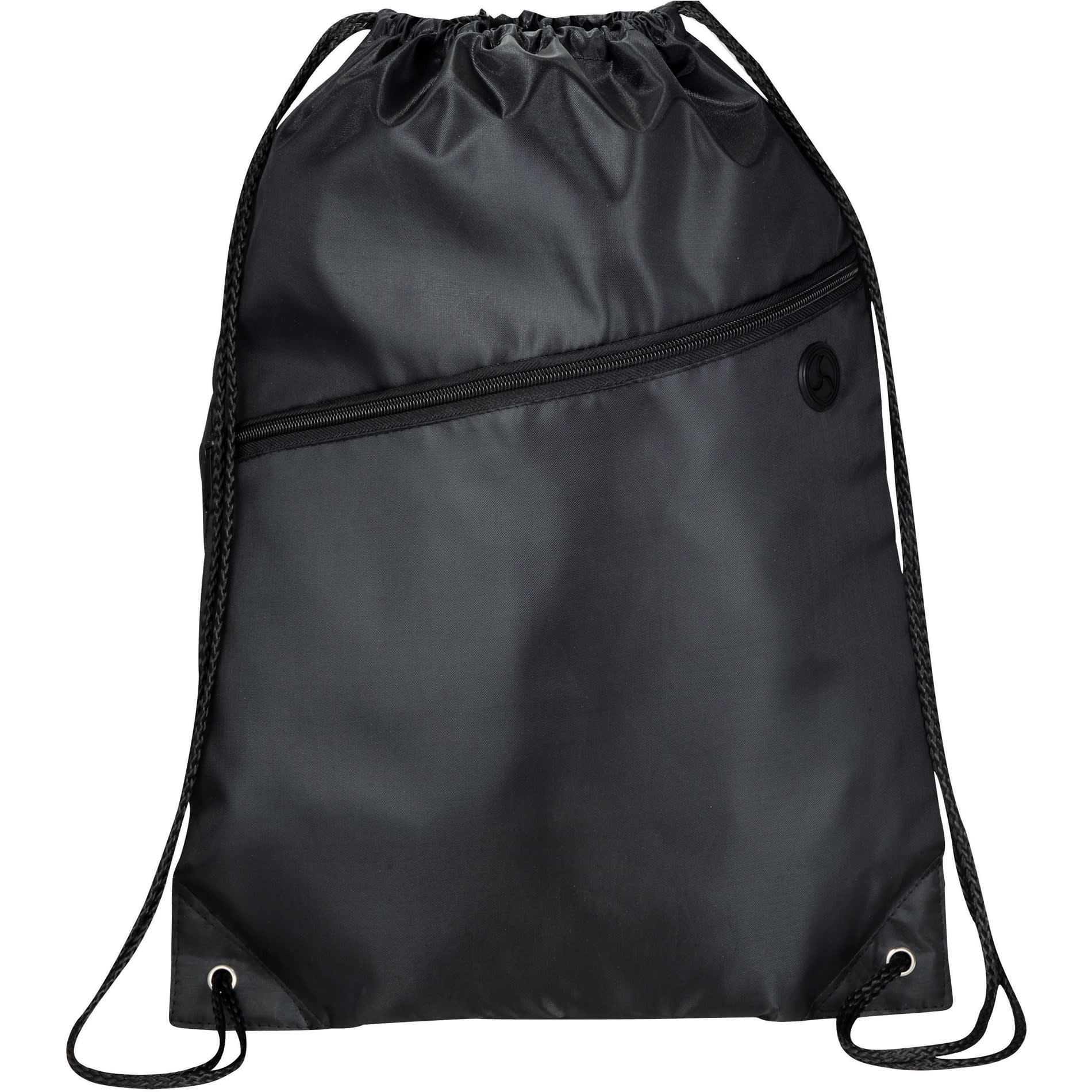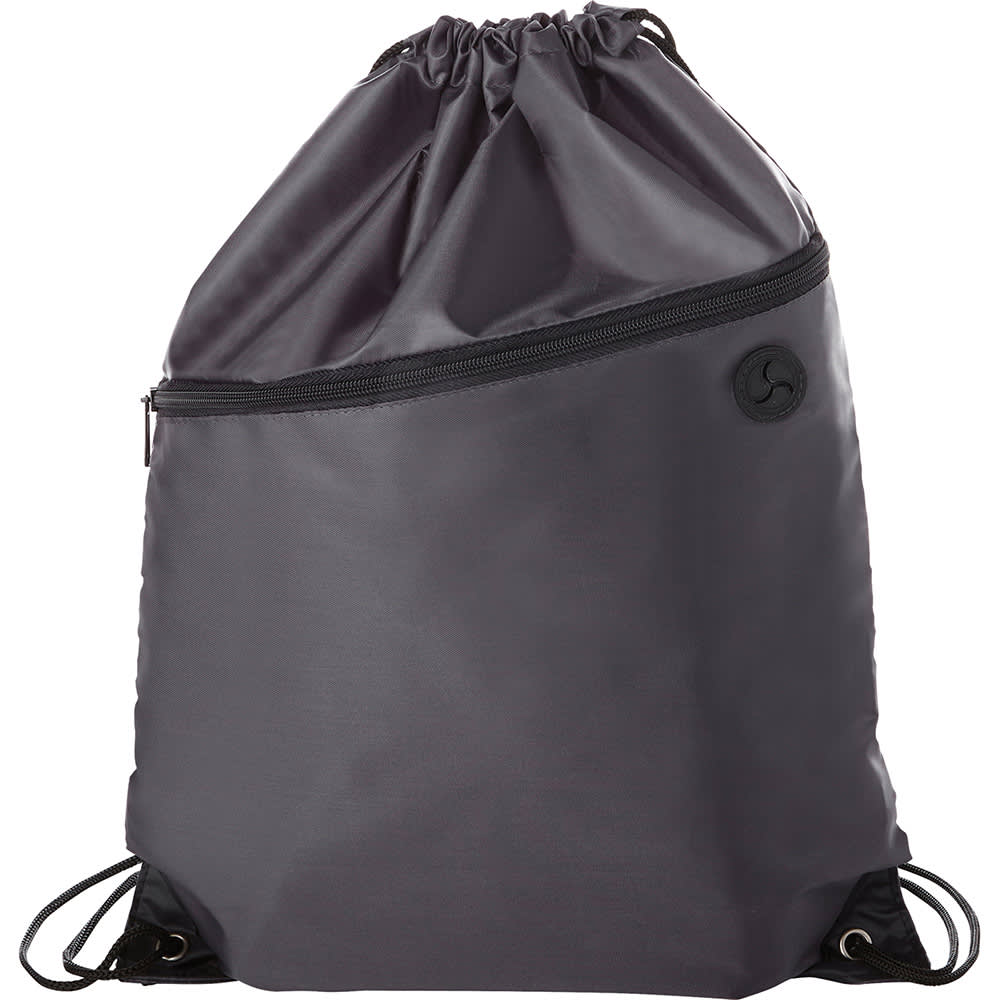 Large main compartment with drawstring rope closure. Zippered front pocket with earbud port. Reinforced corner tabs. Earbuds not included.