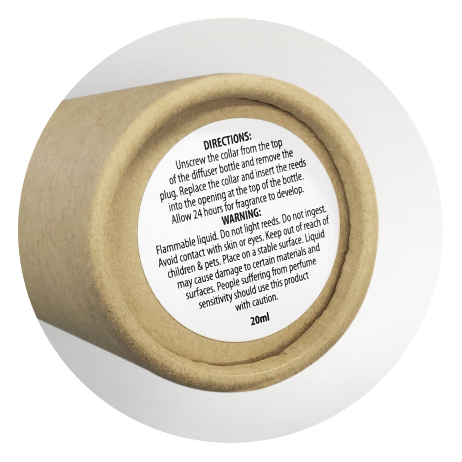 Soothing 20ml vanilla scented diffuser in a glass bottle with a screw on lid creates a relaxing, fragrant environment at home or in the office. The diffuser is presented in a natural kraft paper gift tube. It has instructions and warnings label on the gift tube with plenty of room for branding.