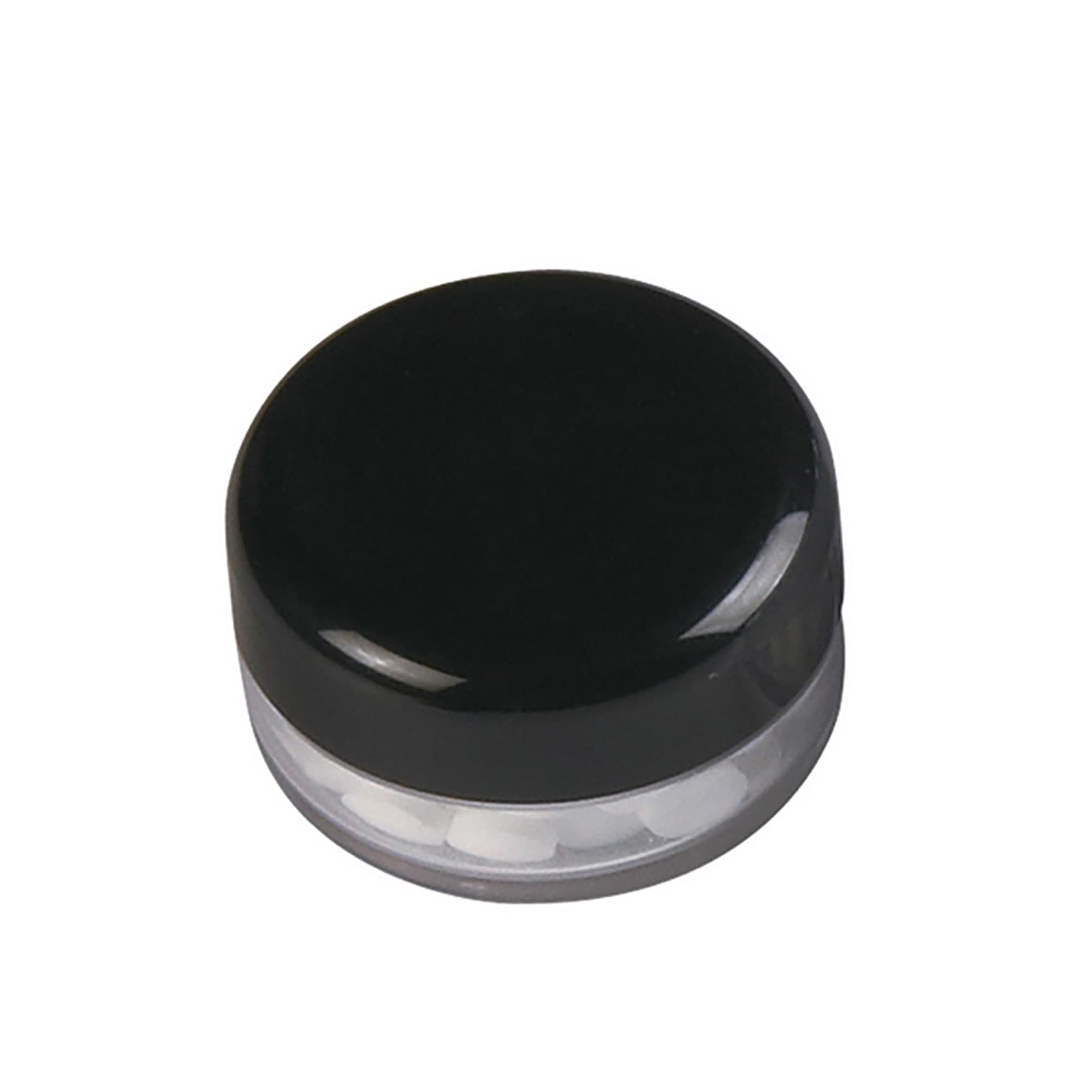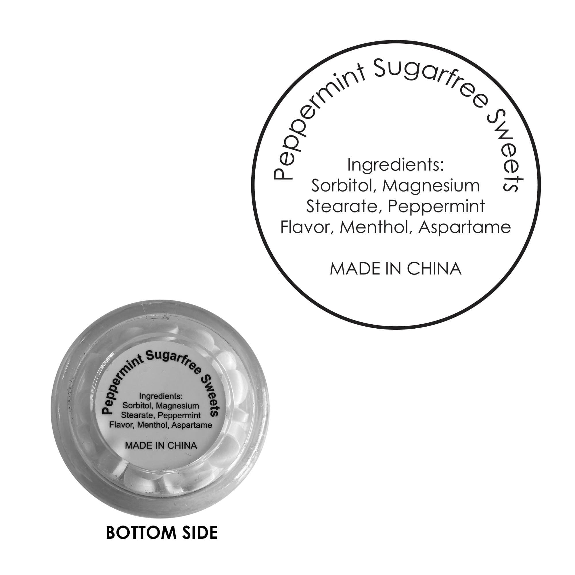 Food grade transparent plastic round mint jar filled with sugar free breath freshener mints(approximately 100pcs) and full ingredient and nutritional information is printed on the back of the tin. Screw on lid sealed with plastic wrapping on the side.