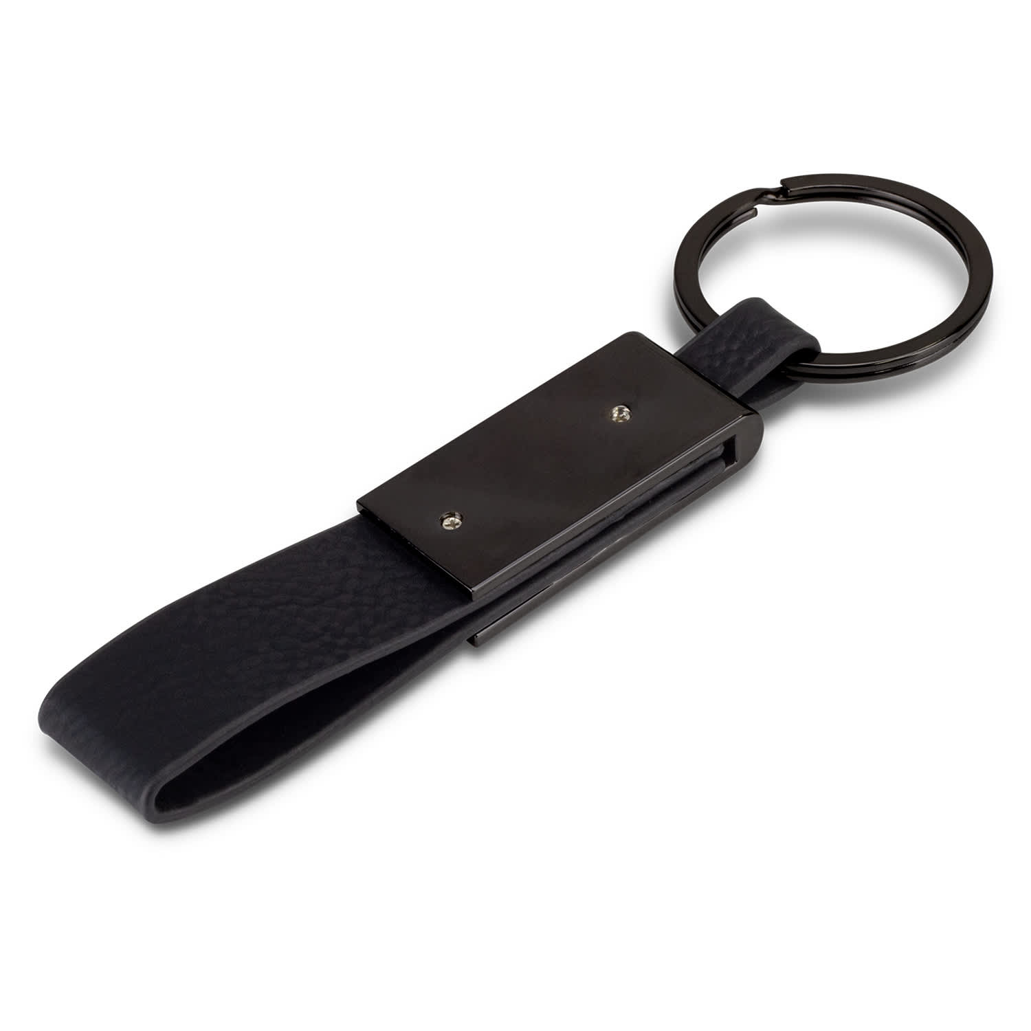 Stylish key ring that has a PU key ring with a nickel ring. It is presented in an individual black box.