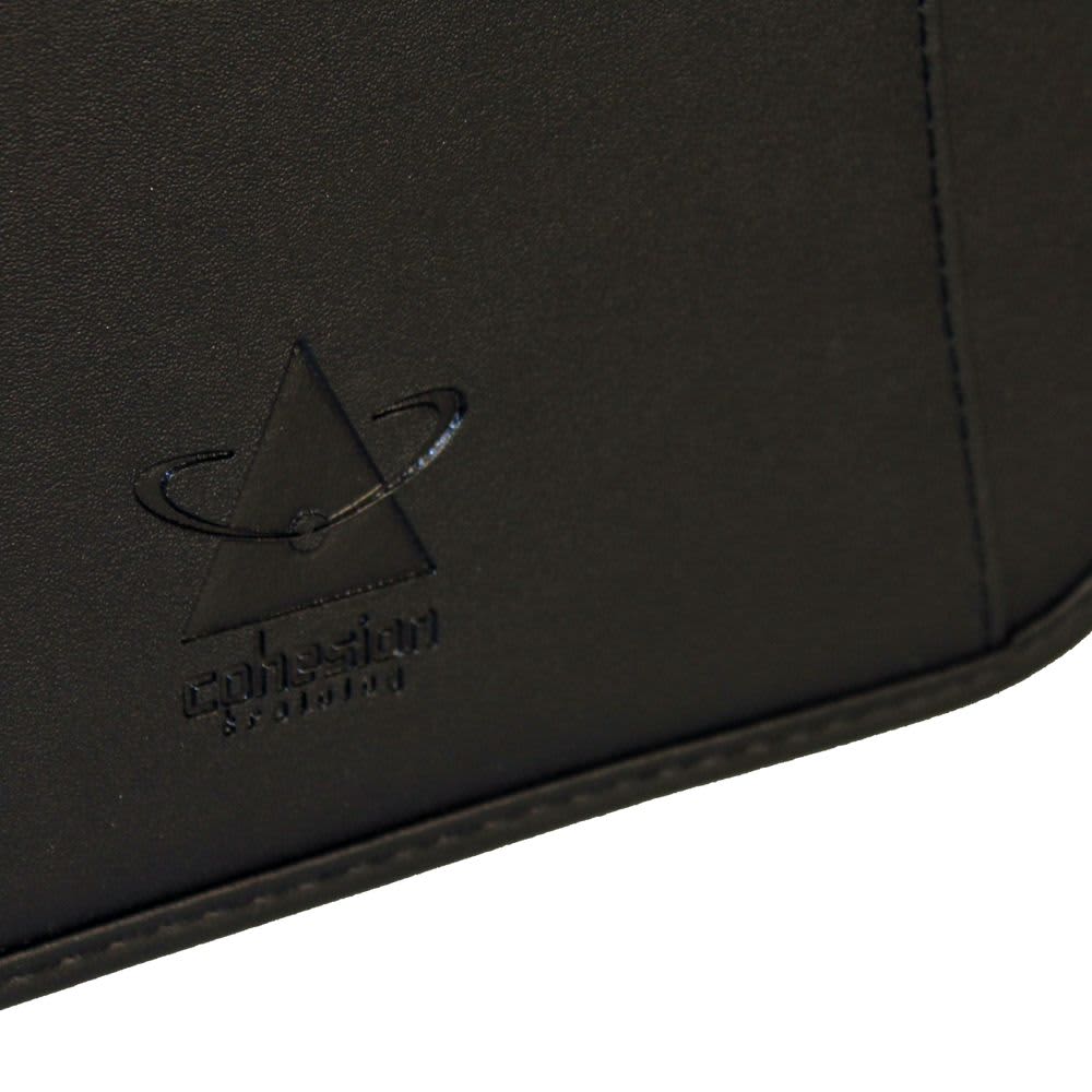 Zippered cover. Includes refillable 30 ruled white page notepad. Front open document pocket. Interior expanding pocket, document pocket, zippered pocket and pen loop. Pen not included.